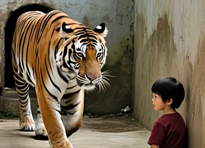 The boy pressed his back to the wall, paralyzed by fear. His tiny hands scraped against the rough stone as if searching for an escape, but there was none. The tiger’s muscles rippled beneath its striped skin as it approached, each paw landing with silent, predatory grace. The audience above expected the worst. Some screamed for zookeepers, others shouted in desperation, but their voices were drowned by the pounding of their own hearts.