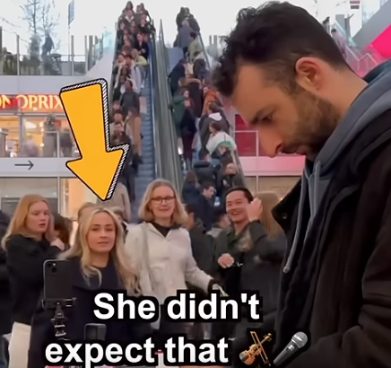 Among them was a young woman who had just stepped off the escalator. An arrow pointed to her in the video, but in that moment, she was simply one of many — unaware that she was about to be caught in a moment of magic. She stopped, her face softening with surprise as the melody grew richer, weaving its spell through the air.