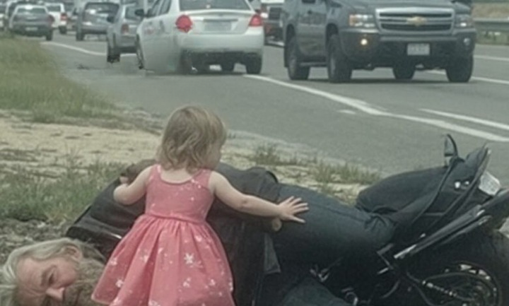 “Mommy! Stop! The motorcycle man is hurt!” she cried, her small fists pounding against the seatbelt that restrained her.